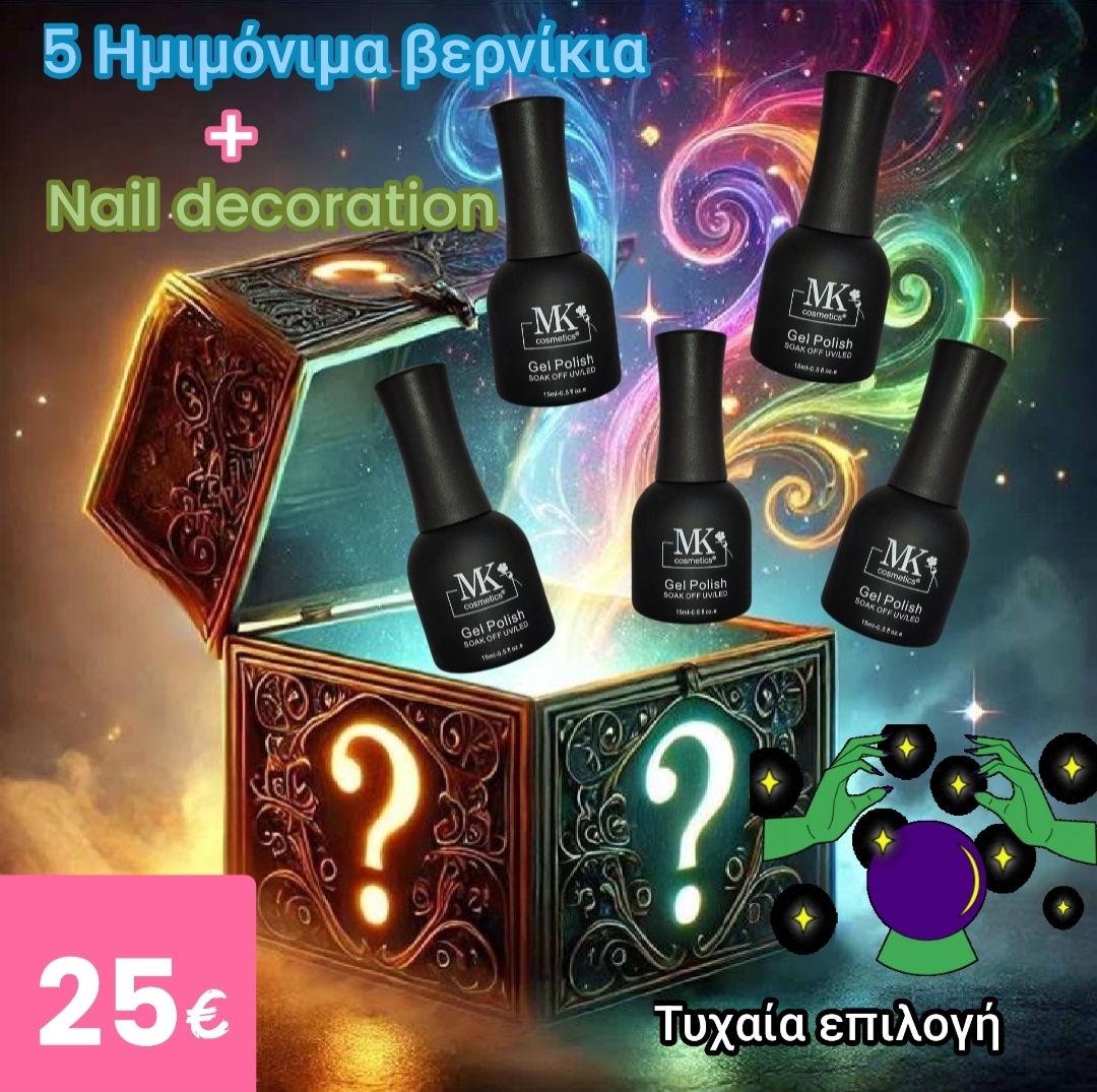 Σε αυτό το mystery box θα βρείς 5 ημιμόνιμα βερνίκια ΕΚΠΛΗΞΗ και διακοσμητικά nail art !!!! σε super μειωμένη τιμή!! Εσύ ποιές αποχρώσεις θα τύχεις στο κουτί σου ??? ΚΑΘΕ ΚΟΥΤΙ ΕΙΝΑΙ ΔΙΑΦΟΡΕΤΙΚΟ ΓΕΜΑΤΟ ΕΚΠΛΗΞΕΙΣ!!!!